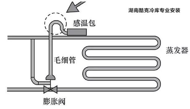 5.毛细管布置:感温包内的液态工质需保持在感温包内,因此感温包应尽量固定在低于阀体顶上波纹膜片腔的吸气管上。若安装位置高于波纹膜片腔,毛细管应向上弯成倒“U”型,防止液体进入波纹膜片腔,影响热力膨胀阀的灵敏度和准确度。湖南冷库安装